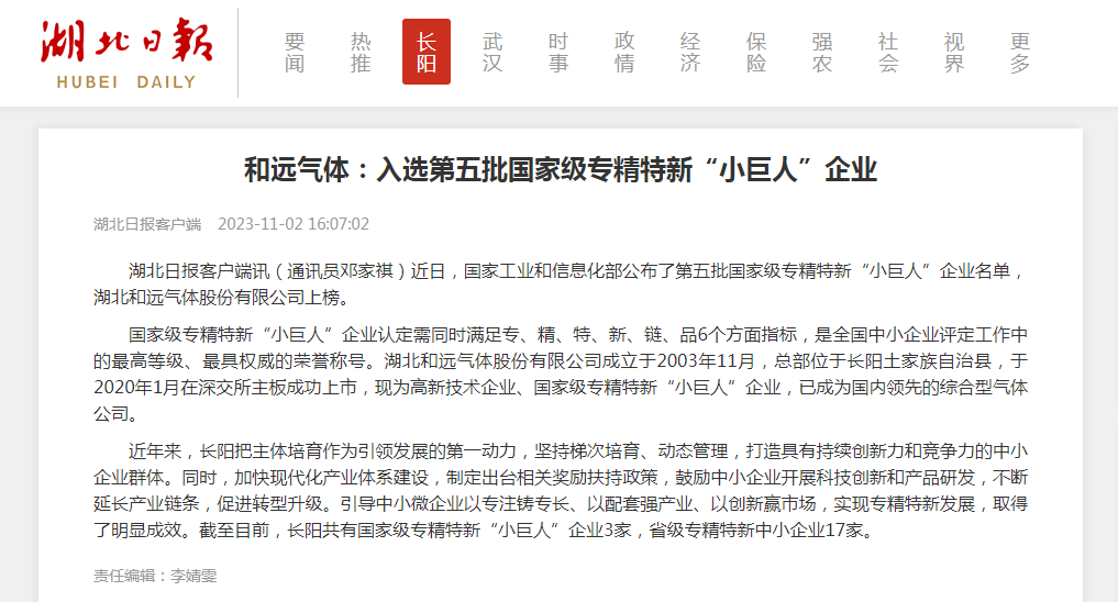 根據(jù)工業(yè)和信息化部文件通告,湖北和遠(yuǎn)氣體股份有限公司入選第五批國(guó)家級(jí)專(zhuān)精特新“小巨人”企業(yè)。