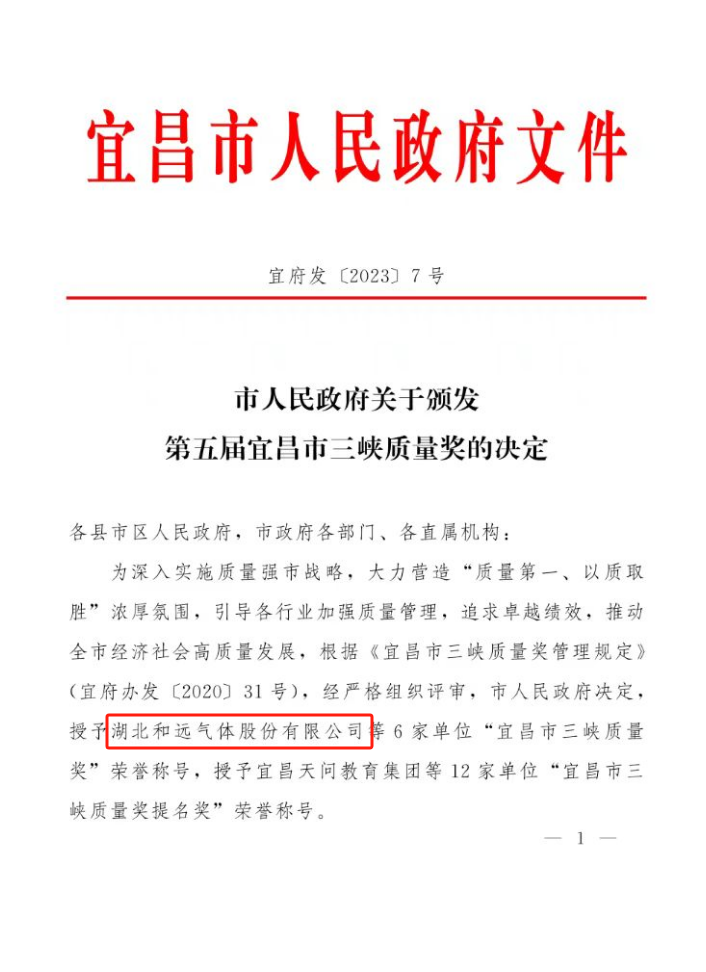 10月13日,經(jīng)過(guò)專(zhuān)家組綜合評(píng)審,和遠(yuǎn)氣體被授予第五屆“宜昌市三峽質(zhì)量獎(jiǎng)”榮譽(yù)稱(chēng)號(hào),該獎(jiǎng)是宜昌市人民政府設(shè)立的最高質(zhì)量榮譽(yù)獎(jiǎng)。